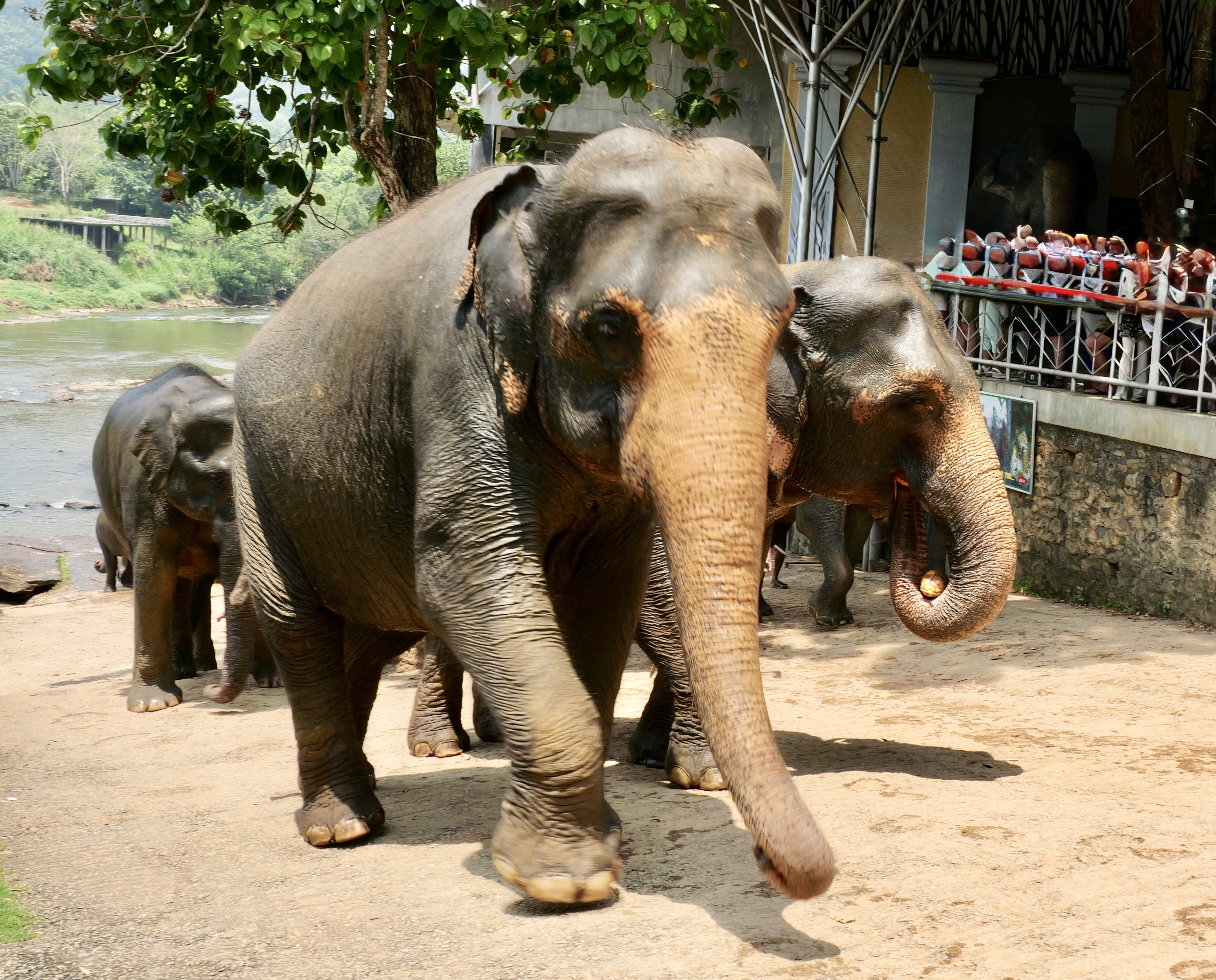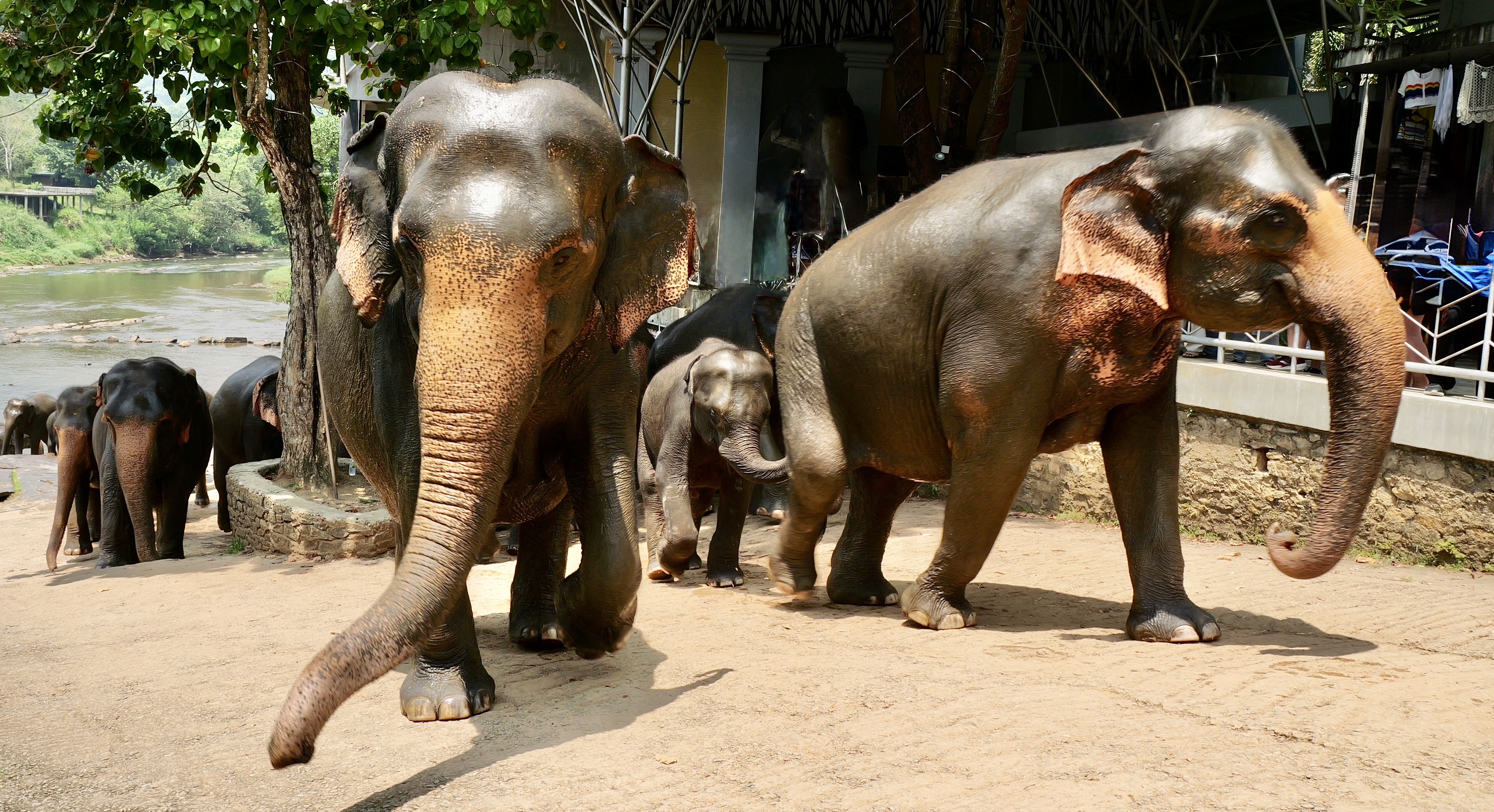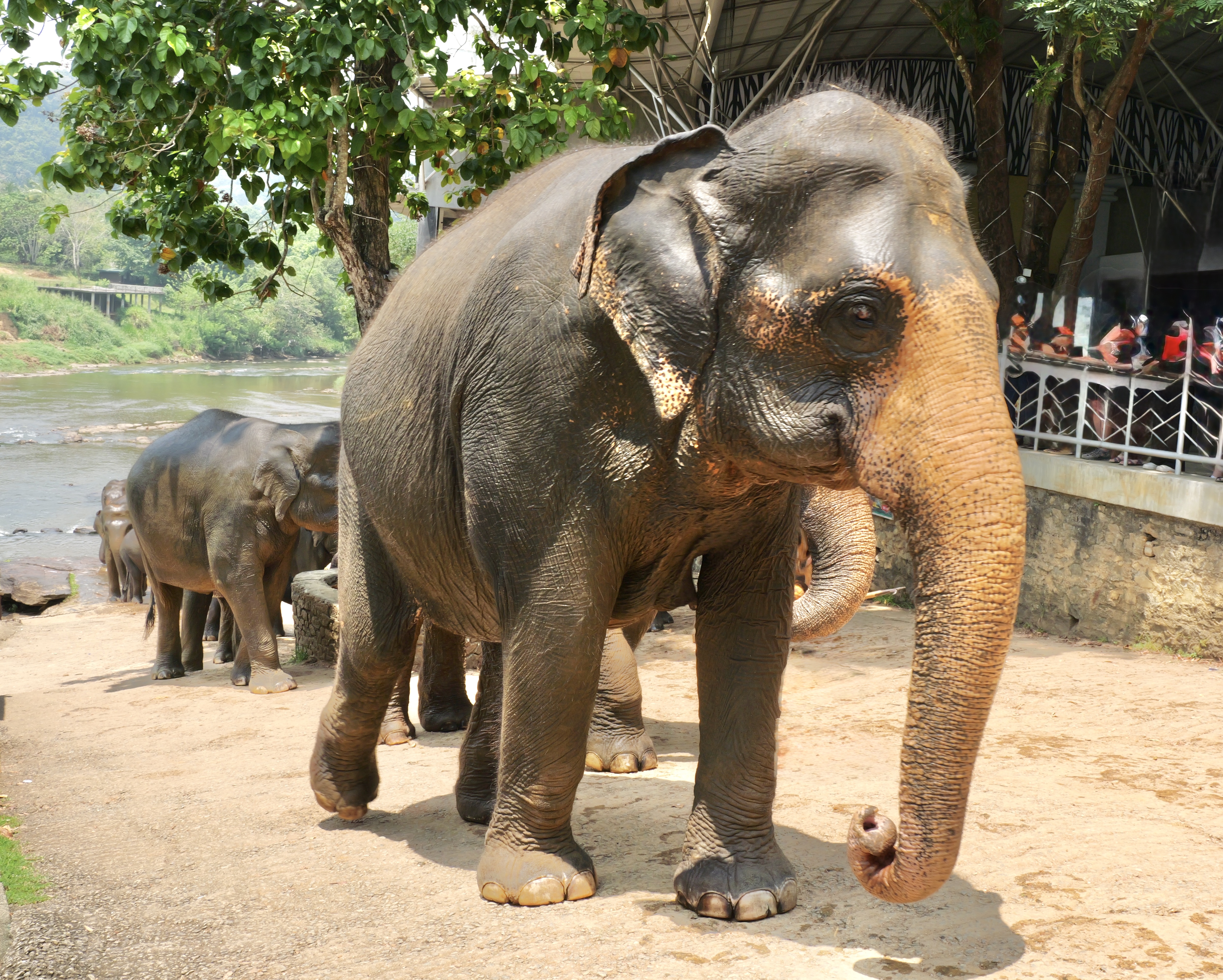 Sri Lanka has 22 million people and more than 6,000 wild elephants in a very small island, southeast of India. The beginnings of this complex are 5 orphaned elephants, put under the care of the government. Expanded to include injured animals, it has become a premier breeding program for the Sri Lankan elephant, a subset of the Asian Elephant.